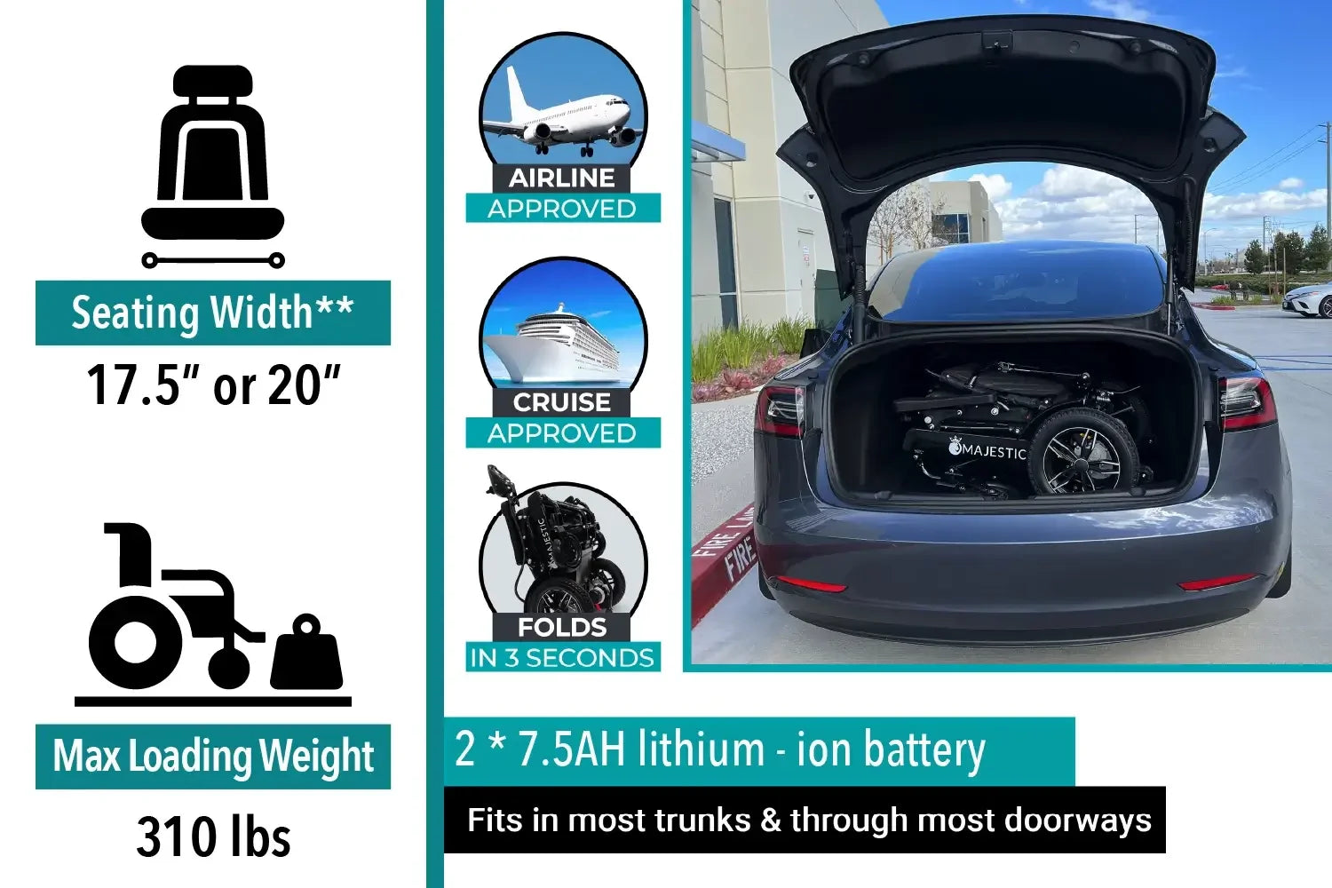 The MAJESTIC IQ-9000 comes equipped with two standard 7.5AH lithium-ion batteries featuring a quick-release function, making them easily removable for travel or charging purposes. These batteries are airline and cruise approved, allowing for seamless travel experiences. Together, they provide an impressive driving range of up to 19 miles. Designed for user convenience, the batteries can work simultaneously and be charged either while installed in the wheelchair or independently, ensuring uninterrupted mobility and ease of use.