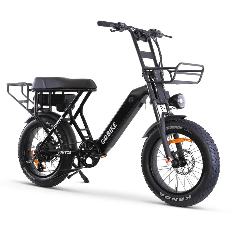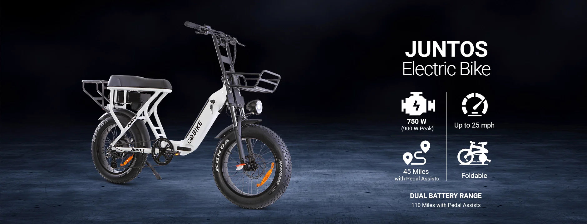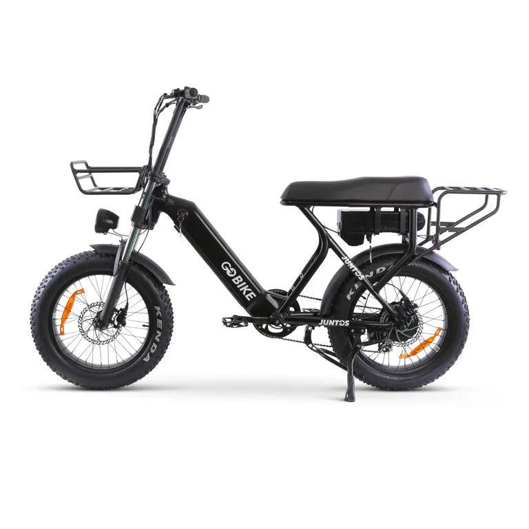 Introducing the GOBIKE JUNTOS, our step-through foldable dual-passenger e-bike. This bike has plenty of power and is perfect for carrying a friend or loved one. We designed JUNTOS to easily carry one or two adult riders and travel up to 110 miles when you add the optional, secondary 17.4Ah battery. The JUNTOS comes standard with a 750w rear hub motor, 11.6Ah primary battery, 7-speed gearing assisted by the Shimano Altus derailleur, a front storage basket, rear storage rack, 20” x 4” Kenda off-road tires, front and rear fenders, and an oversized headlight. We’ve styled it beautifully with seamless welding, an integrated battery, and five amazing colors.