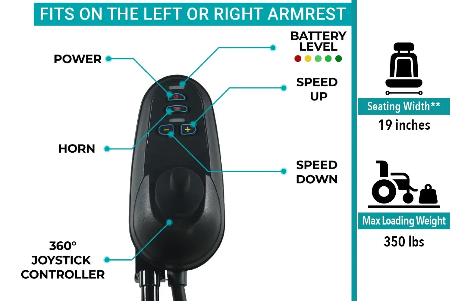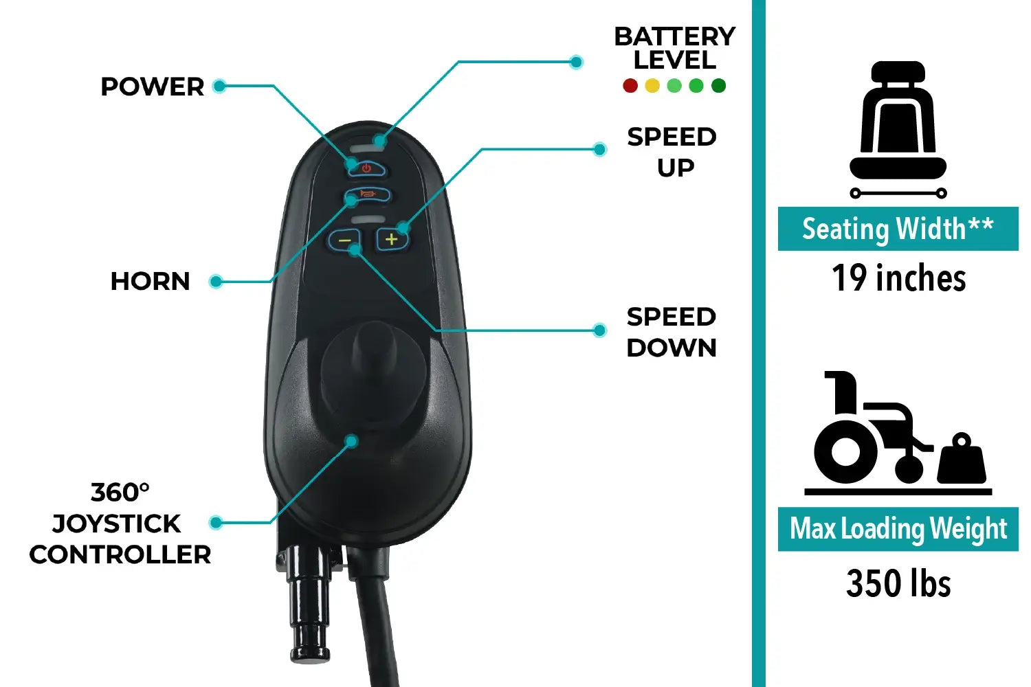 The wheelchair is equipped with a 360-degree universal intelligent joystick that offers easy control and maneuverability. The joystick includes a power on/off button with a power indicator light, speed selection buttons, and a horn for added convenience and safety.