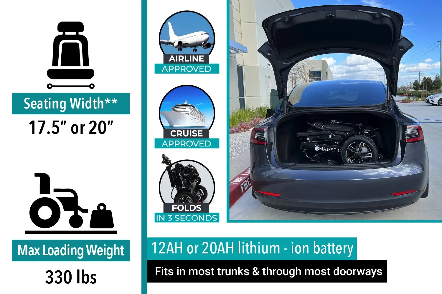 Discover the MAJESTIC IQ-8000 by COMFYGO MOBILITY: a cutting-edge, travel-friendly electric wheelchair designed to elevate your mobility experience. This innovative motorized wheelchair boasts a lightweight, airline-approved design, making it an ideal companion for all your adventures. With its easy-to-fold mechanism, it effortlessly fits into most car trunks, ensuring seamless transportation and storage.