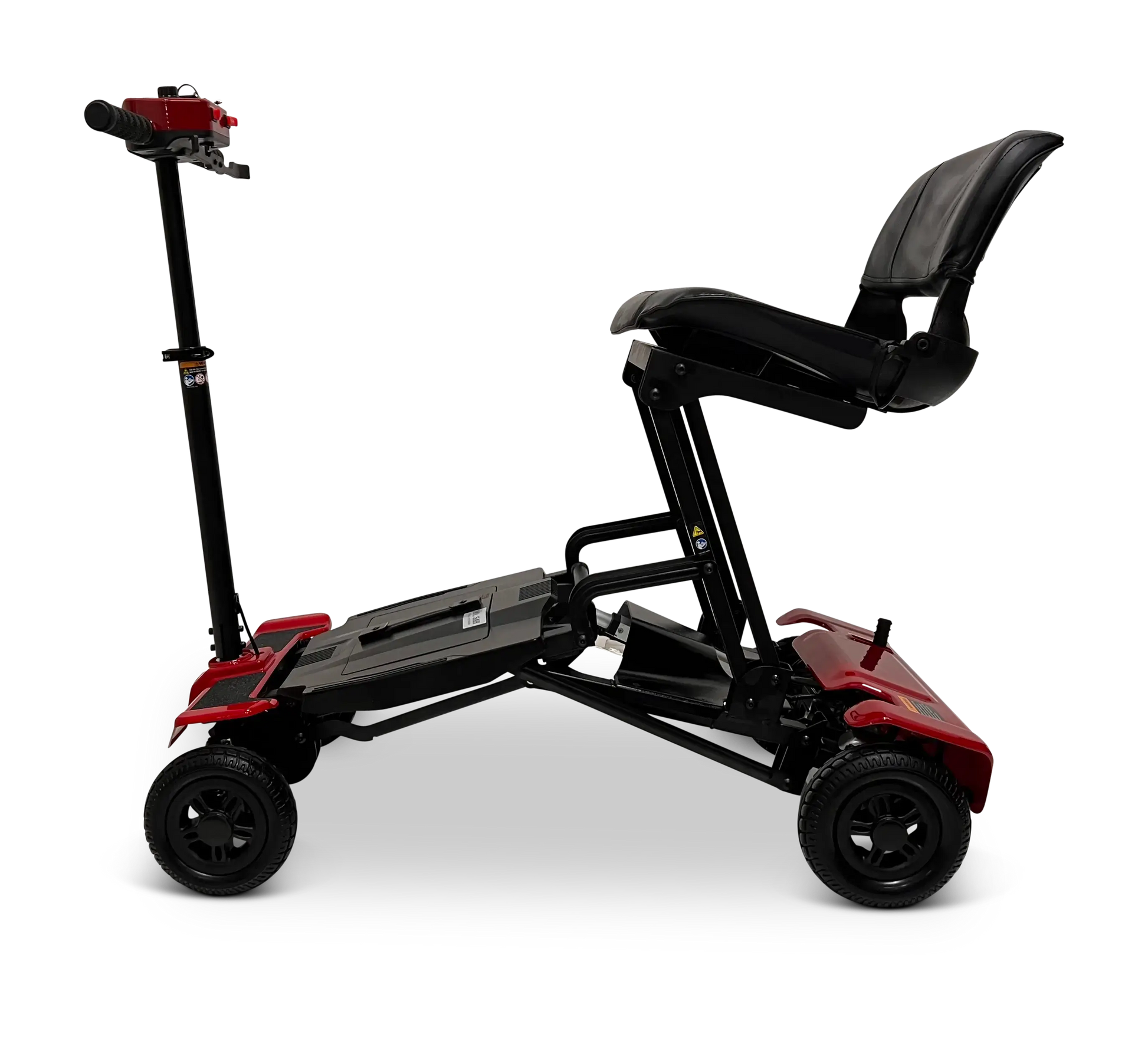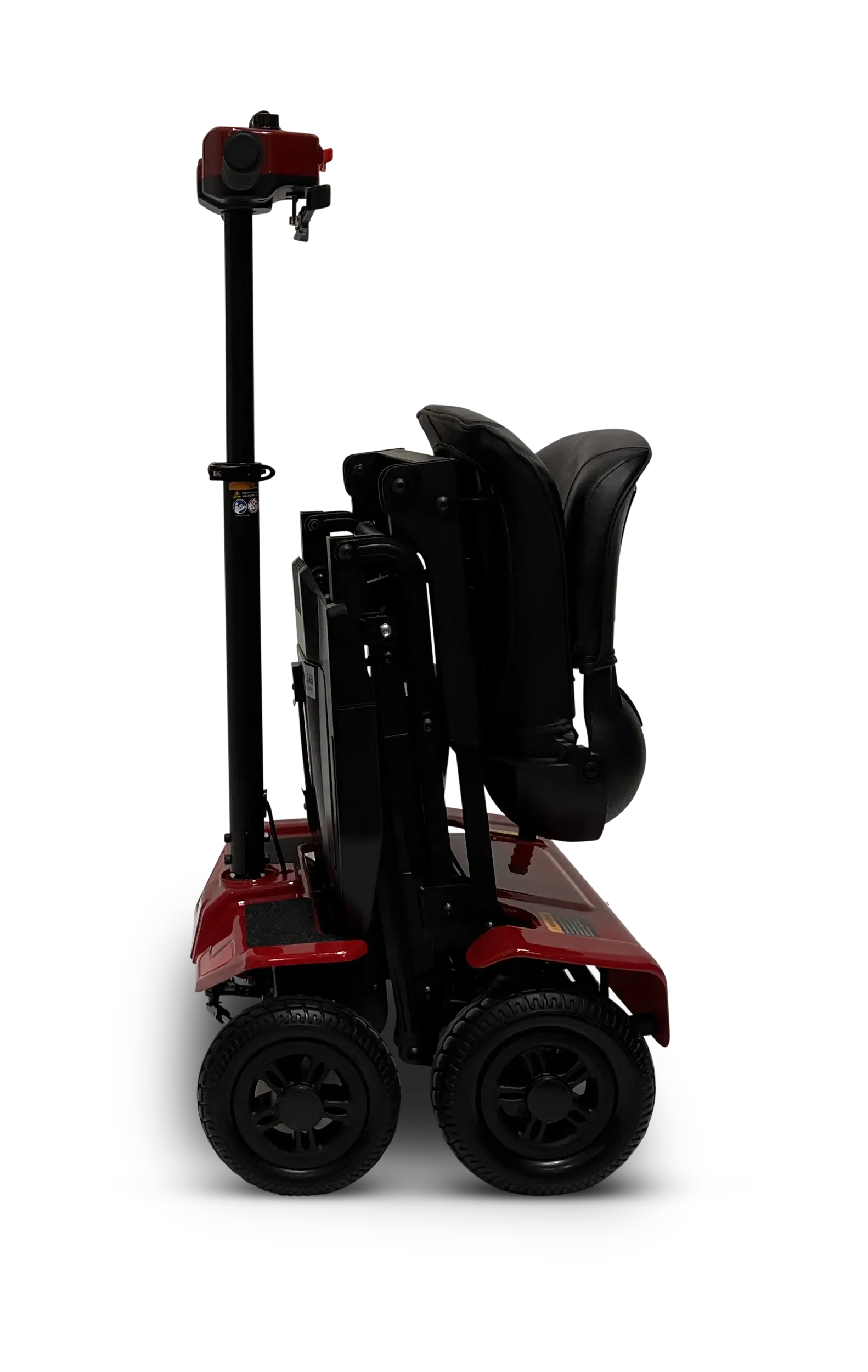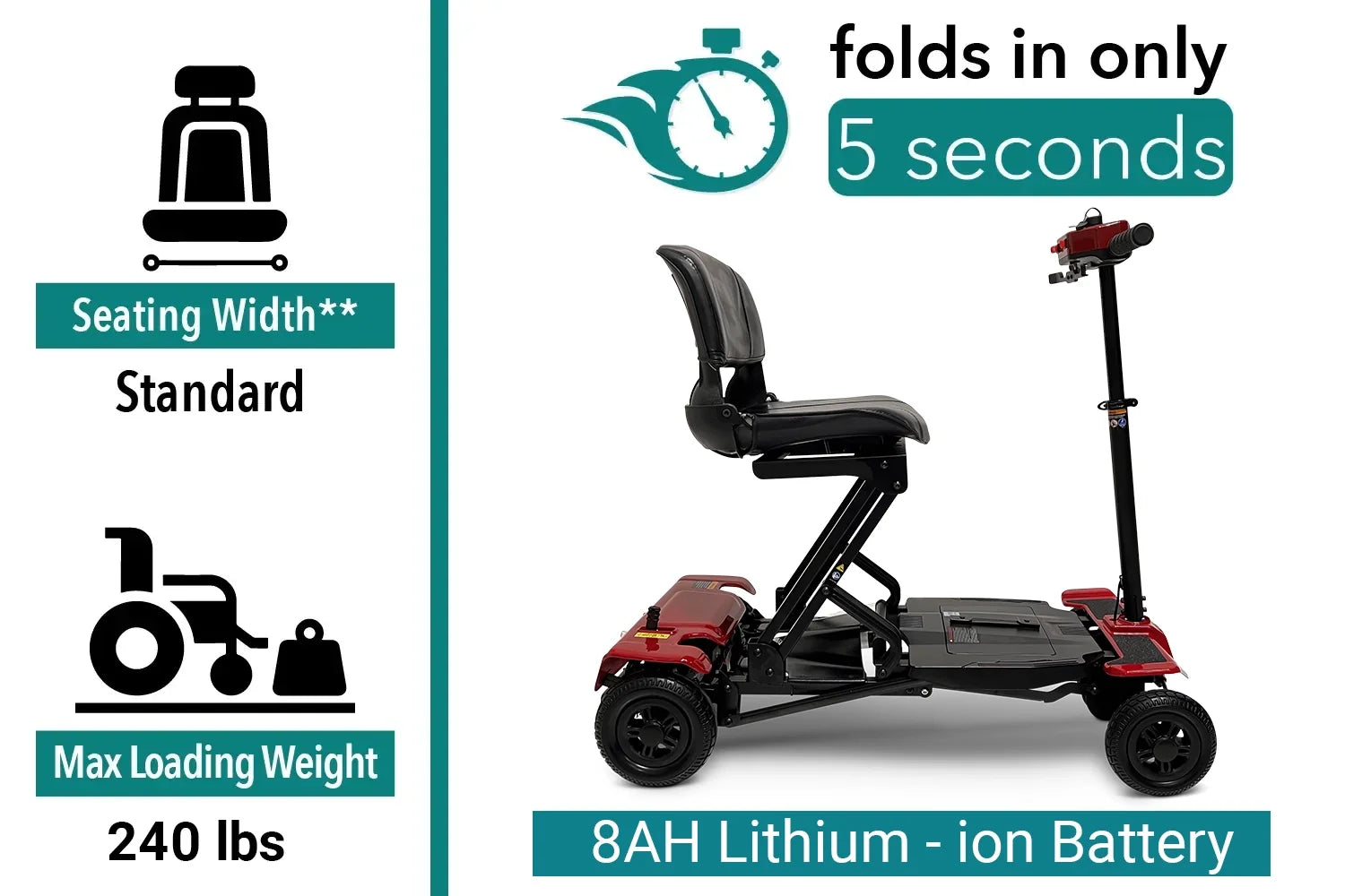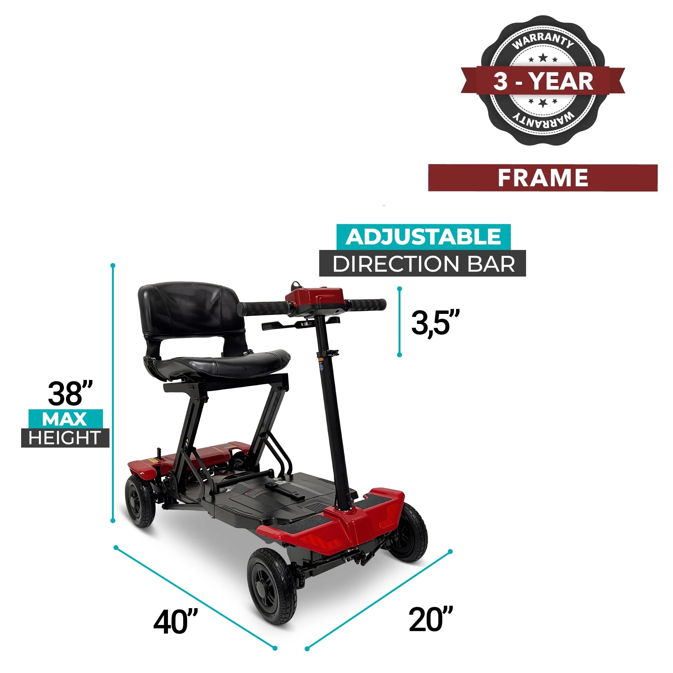 Seat Area Width (inches / mm)16"/406mmSeat Deepth (inches / mm)14.5"/368.3mmSeat Height - from ground (inches / mm)24.5" /622.3mmBackrest Height (inches / mm)26"/660.4mmMax Loading Weight ( lbs / kg)240 lbs /110 KgOverall Product Length (Inches / mm)40" / 1010 mmOverall Product Width (Inches / mm)20"/508 mmOverall Product Height (Inches / mm) - 9" Adjustable handlebar heightMin: 34.5" - Max: 38"Folded Product Length (Inches / mm)19"/ 482.6mmFolded Product Width (Inches / mm)20"/ 508mmFolded Product Height (Inches / mm)26.5" /673.1mmNet Weight without Battery (lbs / kg)66 lbs/30 KgNet Weight with single Battery (lbs / kg)69 lbs /31.3 KgBattery Weight (lbs / kg)3 lbs /1.36 KgBattery Unit1Battery ChargeAC 100-240V, 50Hz,1.5-5ABattery Charge Time (hours)4 to 8 hoursBattery TypeLithium IonBattery Capacity (AH)24V 8AHAirline ApprovedYesRange* (miles / km)Up to 13 mile / 20 kmMax Speed (mph / kph)5 mph / 8 kmhMax Speed for Backward (mph / kph)Braking Safe Distance99" / 2500 mmFront Wheel Diameter (inches / mm)7" / 177 mmRear Wheel Diameter (inches / mm)7" / 177 mmTurning Radius (inches / mm)48" / 1200 mmMotor TypeBrushedMotor Unit1Motor Power (W)24V 250WMax Slope6 degreesFoldingAutomaticSolid TireFront & RearFrame ColorRedPackaging Product Length (Inches / mm)30.5" / 774.70 mmPackaging Product Width (Inches / mm)20" / 508 mmPackaging Product Height (Inches / mm)23" / 584 mmPackaging Weight (lbs / kg)82 lbs / 37.1 kgWHAT'S IN THE BOXMobility Scooter / Seat / Battery / Charger / User ManualFrame Warranty1 yearsMotor Warranty1 yearsBattery Warranty1 yearsParts Warranty1 years
