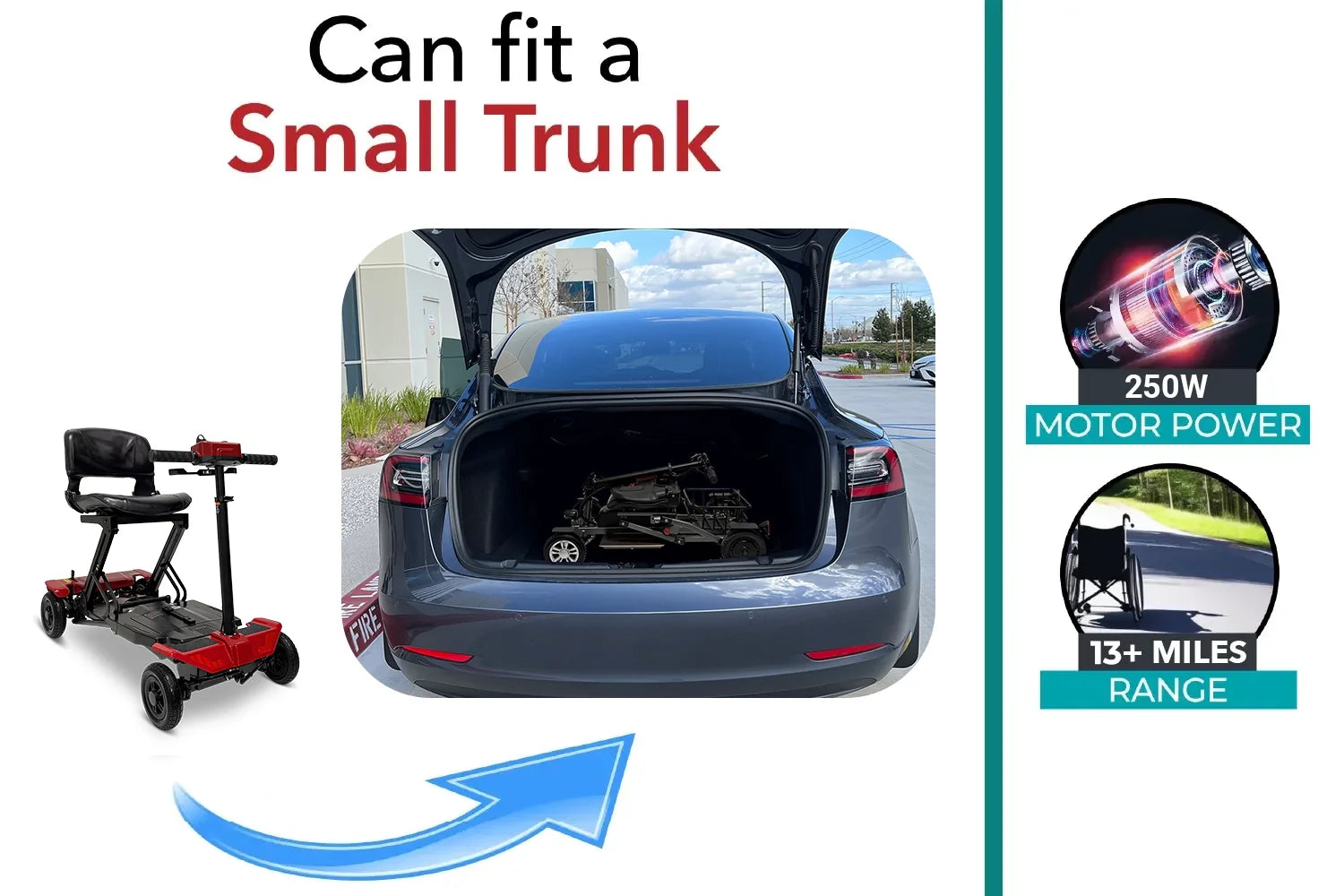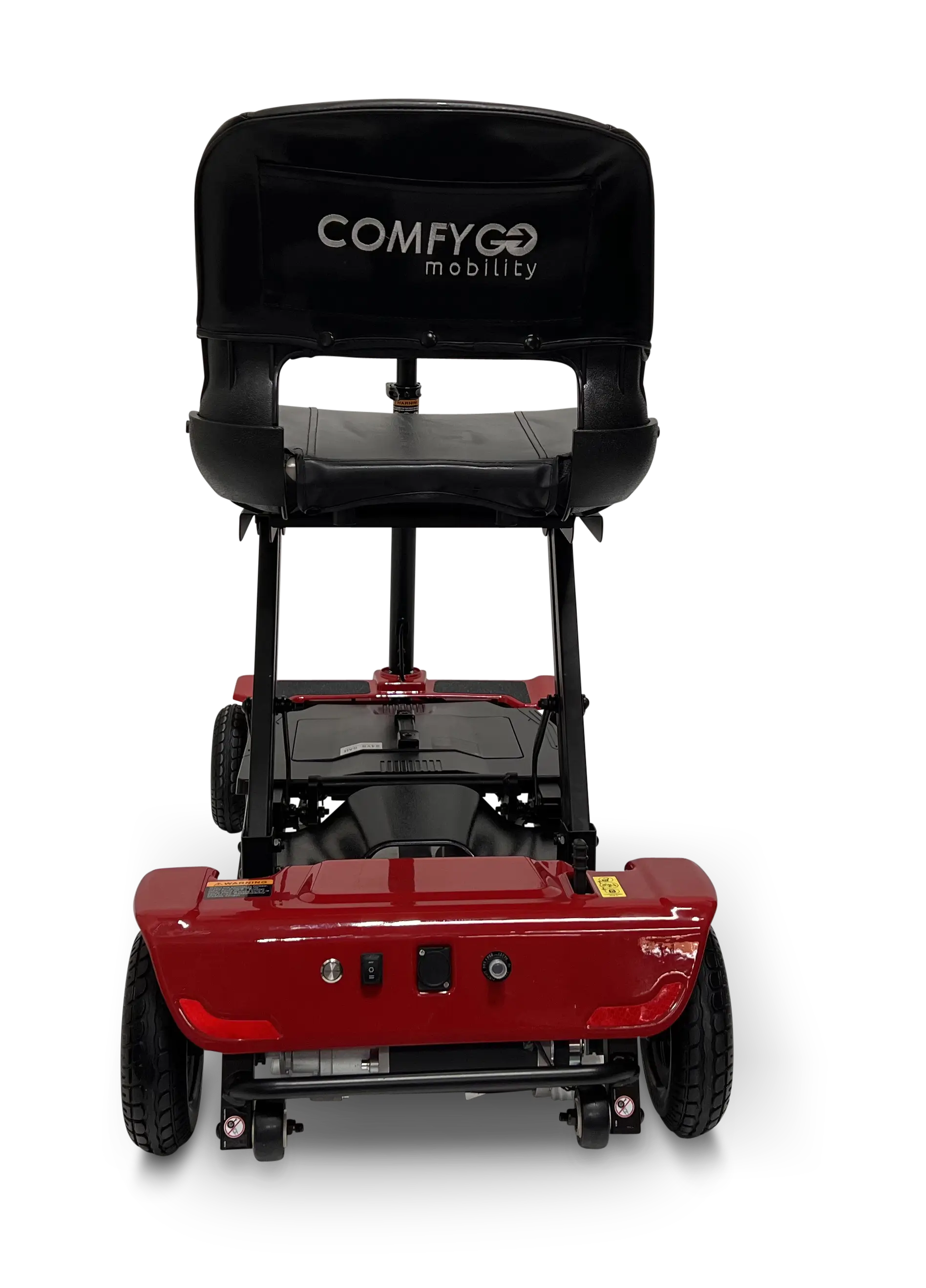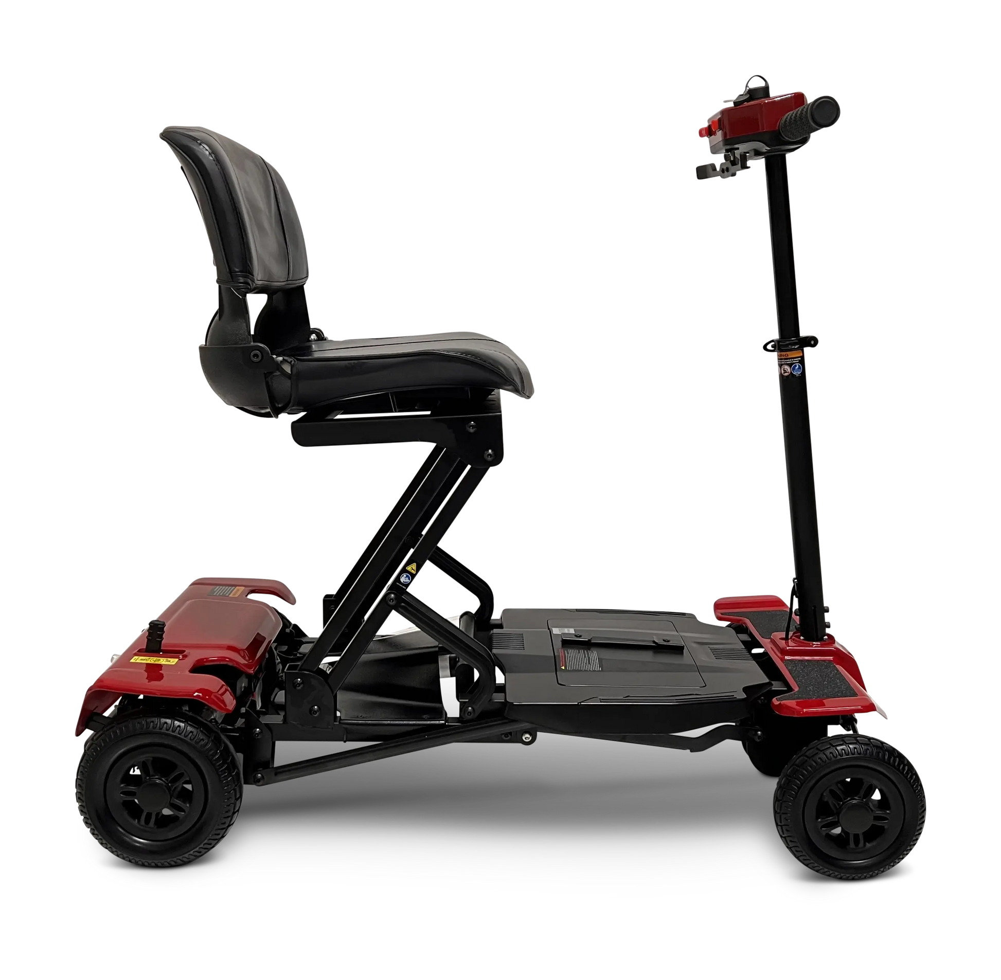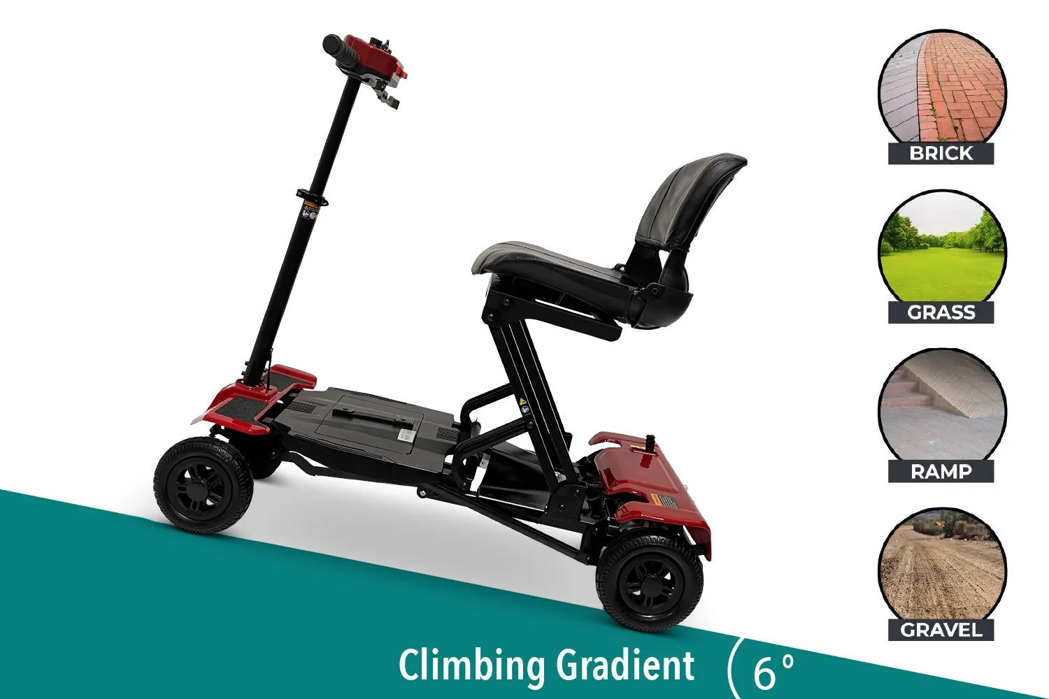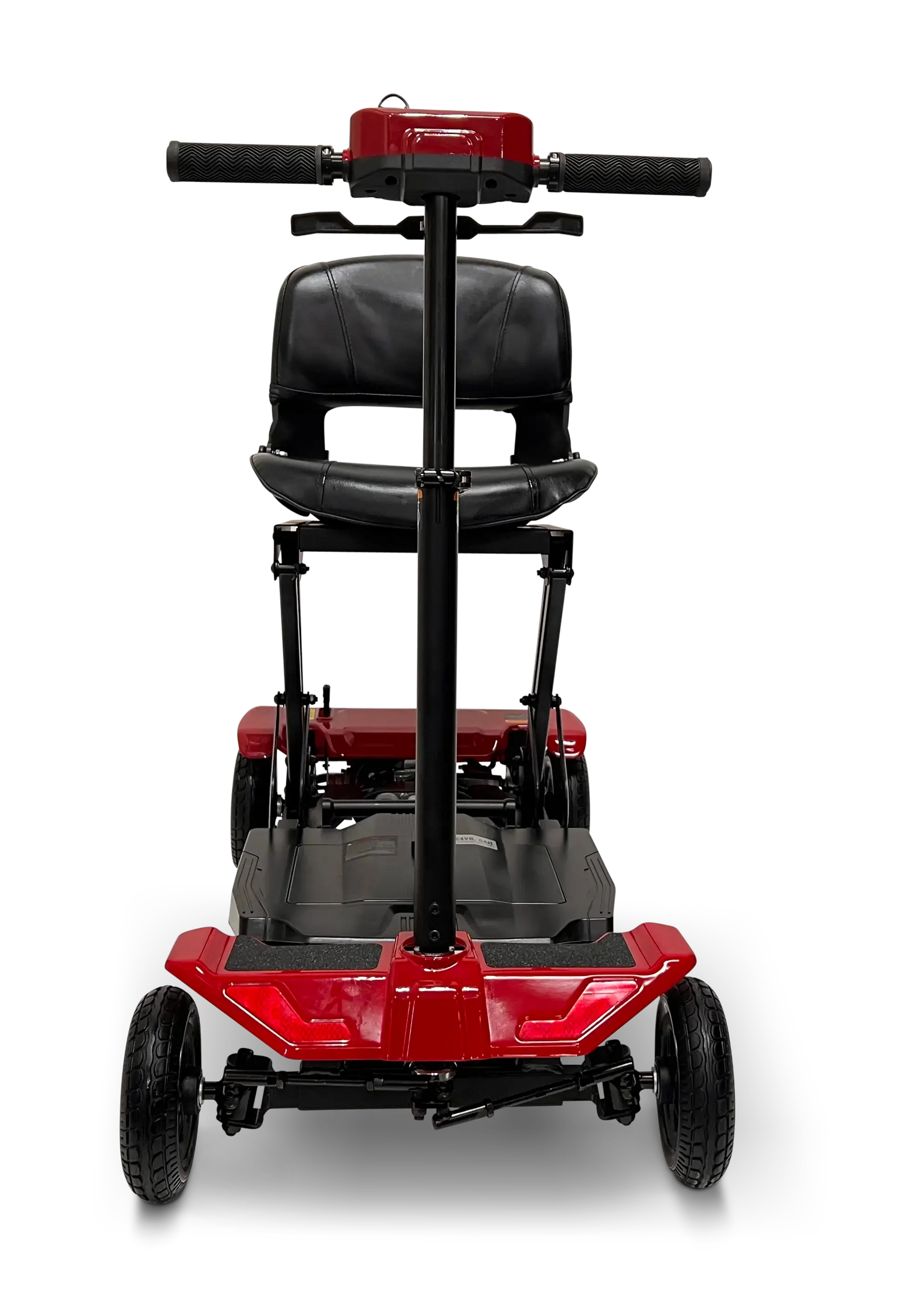 Seat Area Width (inches / mm)16"/406mmSeat Deepth (inches / mm)14.5"/368.3mmSeat Height - from ground (inches / mm)24.5" /622.3mmBackrest Height (inches / mm)26"/660.4mmMax Loading Weight ( lbs / kg)240 lbs /110 KgOverall Product Length (Inches / mm)40" / 1010 mmOverall Product Width (Inches / mm)20"/508 mmOverall Product Height (Inches / mm) - 9" Adjustable handlebar heightMin: 34.5" - Max: 38"Folded Product Length (Inches / mm)19"/ 482.6mmFolded Product Width (Inches / mm)20"/ 508mmFolded Product Height (Inches / mm)26.5" /673.1mmNet Weight without Battery (lbs / kg)66 lbs/30 KgNet Weight with single Battery (lbs / kg)69 lbs /31.3 KgBattery Weight (lbs / kg)3 lbs /1.36 KgBattery Unit1Battery ChargeAC 100-240V, 50Hz,1.5-5ABattery Charge Time (hours)4 to 8 hoursBattery TypeLithium IonBattery Capacity (AH)24V 8AHAirline ApprovedYesRange* (miles / km)Up to 13 mile / 20 kmMax Speed (mph / kph)5 mph / 8 kmhMax Speed for Backward (mph / kph)Braking Safe Distance99" / 2500 mmFront Wheel Diameter (inches / mm)7" / 177 mmRear Wheel Diameter (inches / mm)7" / 177 mmTurning Radius (inches / mm)48" / 1200 mmMotor TypeBrushedMotor Unit1Motor Power (W)24V 250WMax Slope6 degreesFoldingAutomaticSolid TireFront & RearFrame ColorRedPackaging Product Length (Inches / mm)30.5" / 774.70 mmPackaging Product Width (Inches / mm)20" / 508 mmPackaging Product Height (Inches / mm)23" / 584 mmPackaging Weight (lbs / kg)82 lbs / 37.1 kgWHAT'S IN THE BOXMobility Scooter / Seat / Battery / Charger / User ManualFrame Warranty1 yearsMotor Warranty1 yearsBattery Warranty1 yearsParts Warranty1 years