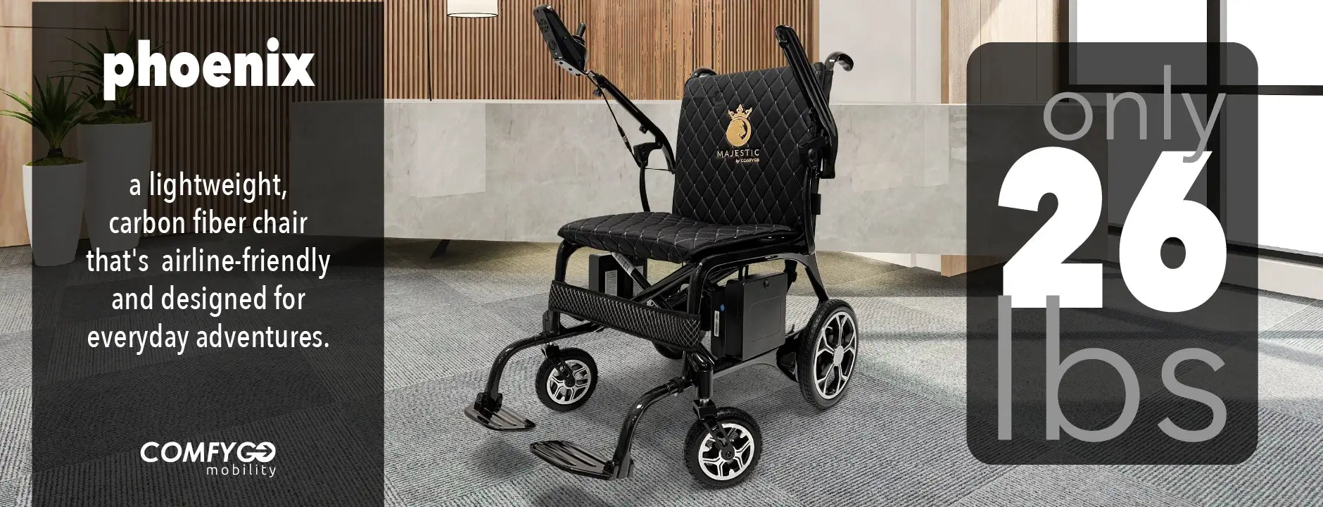 The ComfyGO Phoenix carbon fiber electric wheelchair boasts a lightweight frame and two battery options, providing both versatility and convenience. The phoenix offers unrivaled comfort. Experience the perfect blend of style, comfort, and functionality.