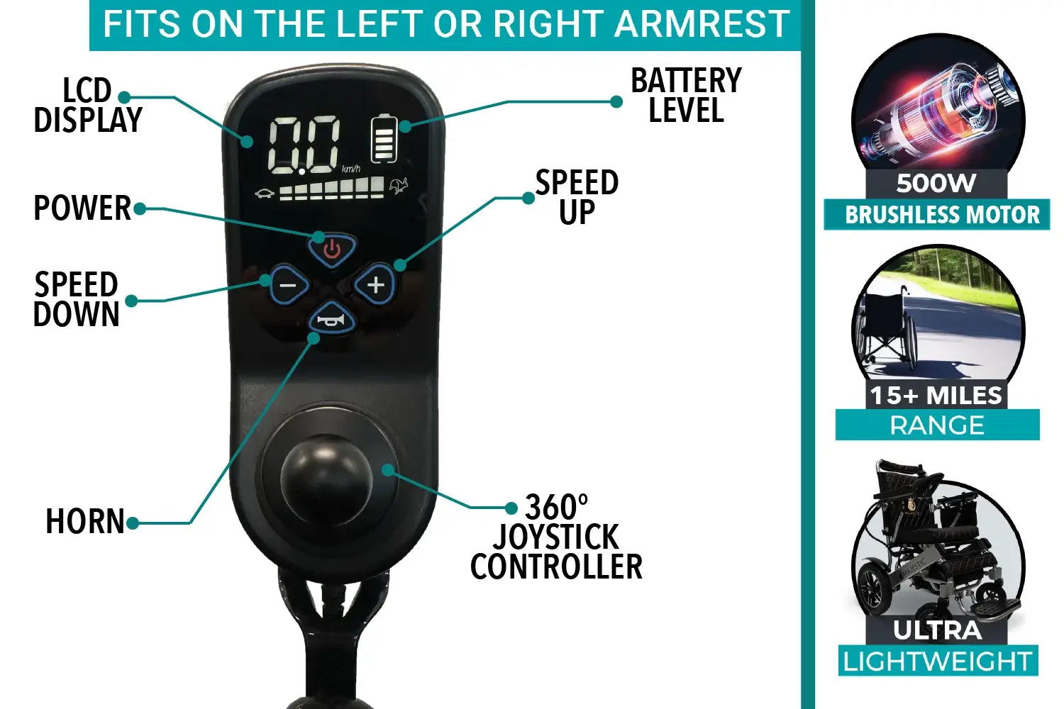 At a mere 26 lbs (main frame only), the ComfyGO Phoenix stands as one of thelightest electric wheelchairsavailable, offering unparalleled ease of use and portability. Our dedication to quality is evident in the comprehensive warranties we provide: a 1-year warranty on the frame, and a 1-year warranty on the electronics, motors and battery. The Phoenix wheelchair also features a 360-degree universalintelligent digital joystickwith anLCD display, ensuring precise and effortless control over your mobility.
