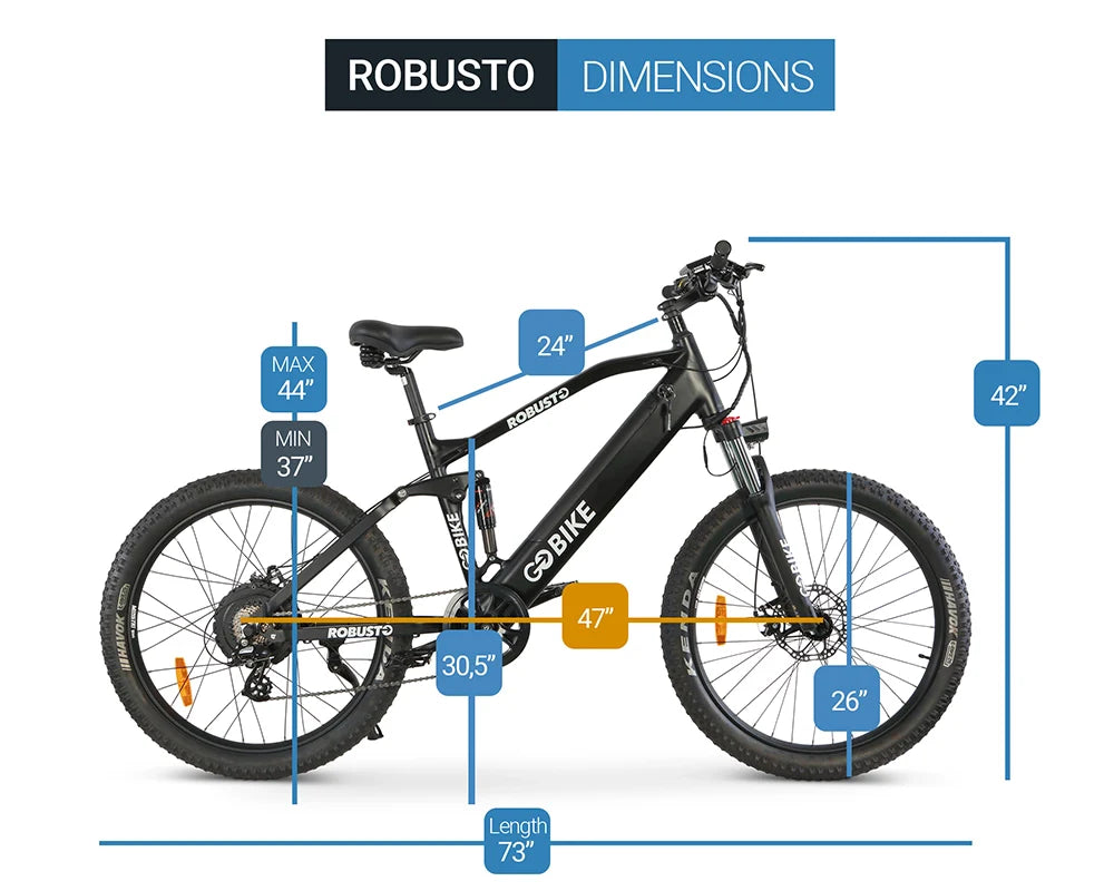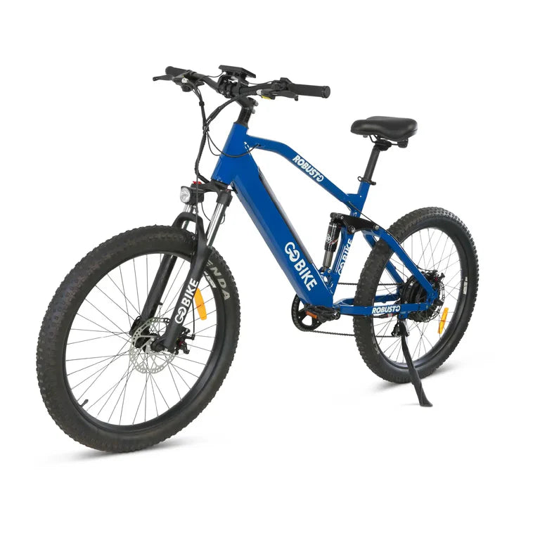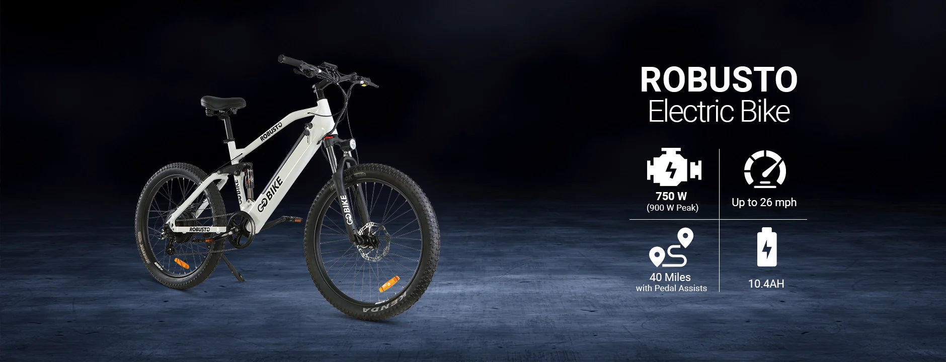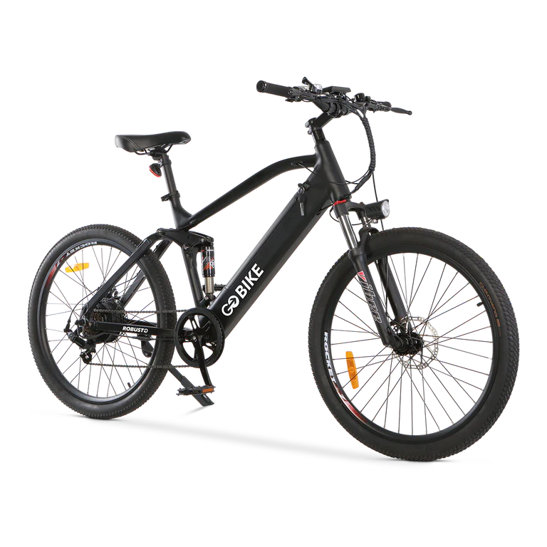 The GOBIKE ROBUSTO is a blast to ride on and off roads. It boasts a powerful 750w rear hub motor, full front and rear suspension, and large 26” x 3” tires. With its five levels of Pedal Assist, power is delivered to the ROBUSTO by simply pedaling or by using the thumb throttle. The upgraded Shimano Altus derailleur delivers smooth shifting through its seven gears. The ROBUSTO is made from high grade aluminum that is lightweight and robust. Purchase a ROBUSTO and prepare yourself for new adventures while exploring new destinations.