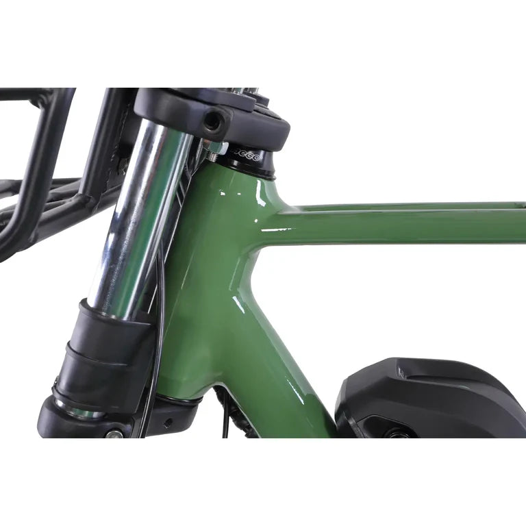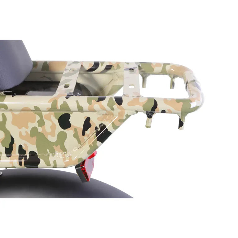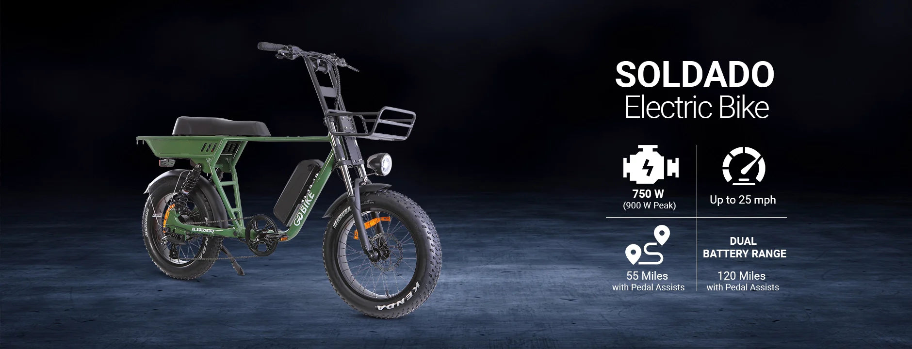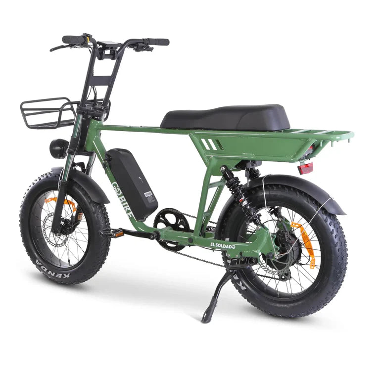 Introducing the GOBIKE SOLDADO. This dual-passenger e-bike is designed to carry one or two adult riders on and off roads. We’ve included a large 14.5Ah battery with the ability to add a secondary 17.4Ah battery which gives you massive range to SOLDIER on. The SOLDADO includes a 750w rear hub motor, 7-speed gearing assisted by the Shimano Altus derailleur, a front storage basket, rear storage rack, 20” x 4” Kenda off-road tires, front and rear fenders, front and rear suspension, and an oversized headlight. The SOLDADO has a rugged look and off road feel and comes in three unique military colors.
