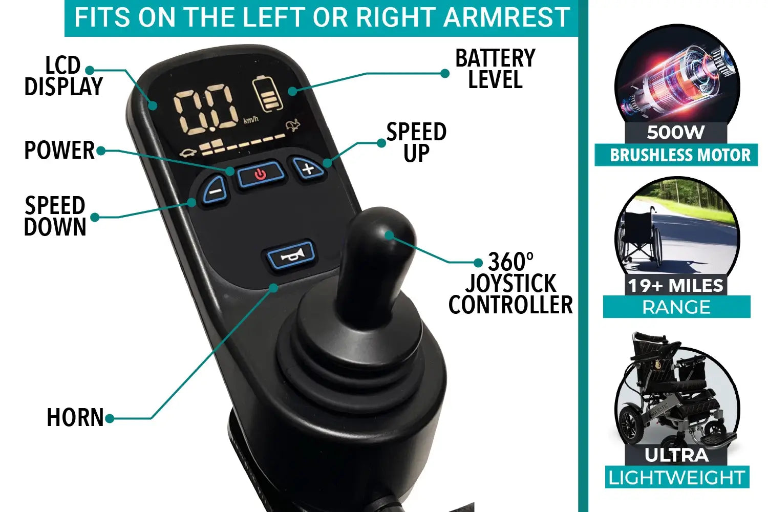 At a mere 40 lbs without the battery, the ComfyGO X-7 stands as one of thelightest electric wheelchairsavailable, offering unparalleled ease of use and portability. Our dedication to quality is evident in the comprehensive warranties we provide: a 3-year warranty on the frame, and a 1-year warranty on the electronics, motors and battery. The X-7 wheelchair also features a 360-degree universalintelligent digital joystickwith anLCD display, ensuring precise and effortless control over your mobility.